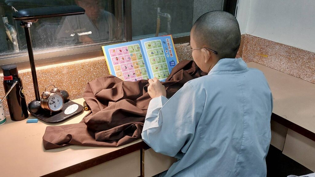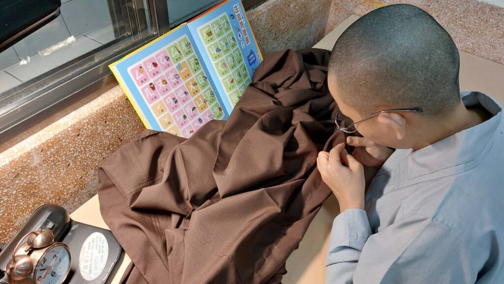 看哪 ~一面縫著袈裟,一面背中文……