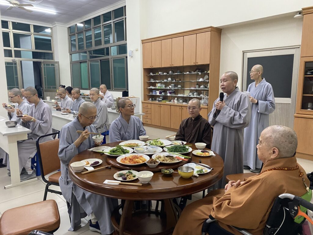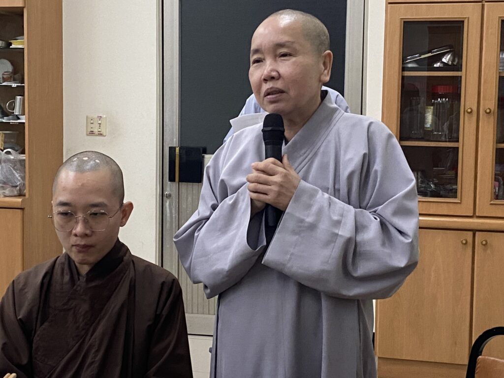 4月1日早齋前,本院學生齊集大殿,向長老尼接駕,長老尼並作簡短開示,分享早年求學經驗。隨後,與院長在餐會上進行交流,在座法師也藉機向長老尼請教關於越南佛教現況,因而對越南佛教有更進一步之認識與理解。
